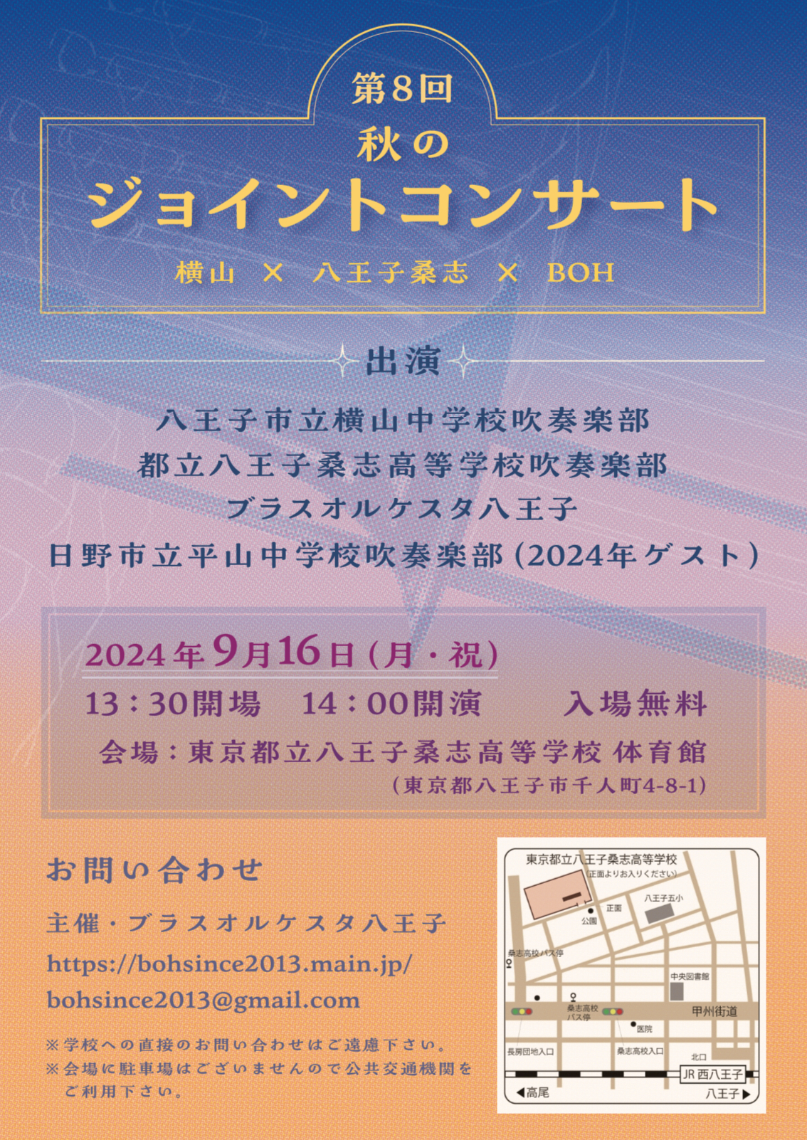ジョイントコンサートは9/16(祝・月)に八王子桑志高校の体育館で開催されます!